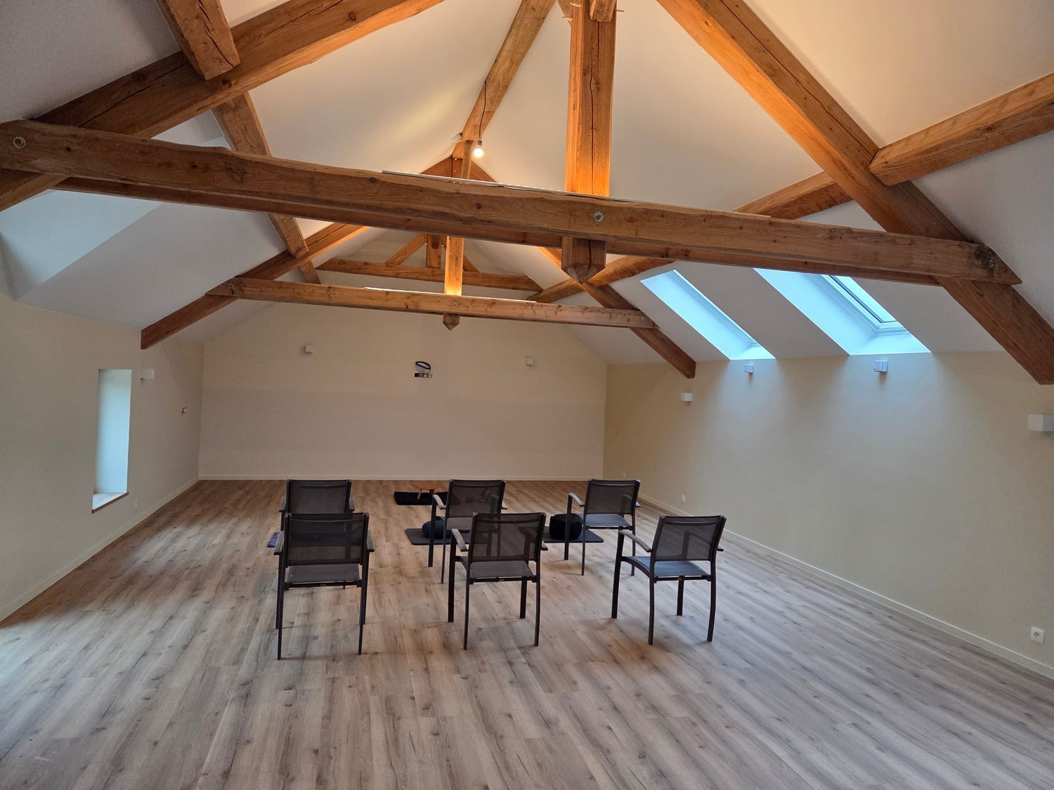 La salle de méditation, chaleureuse et lumineuse, se distingue par ses poutres apparentes et son ambiance douce, idéale pour se détendre, se recentrer et lâcher prise. Tout a été pensé pour favoriser le bien-être et la sérénité.