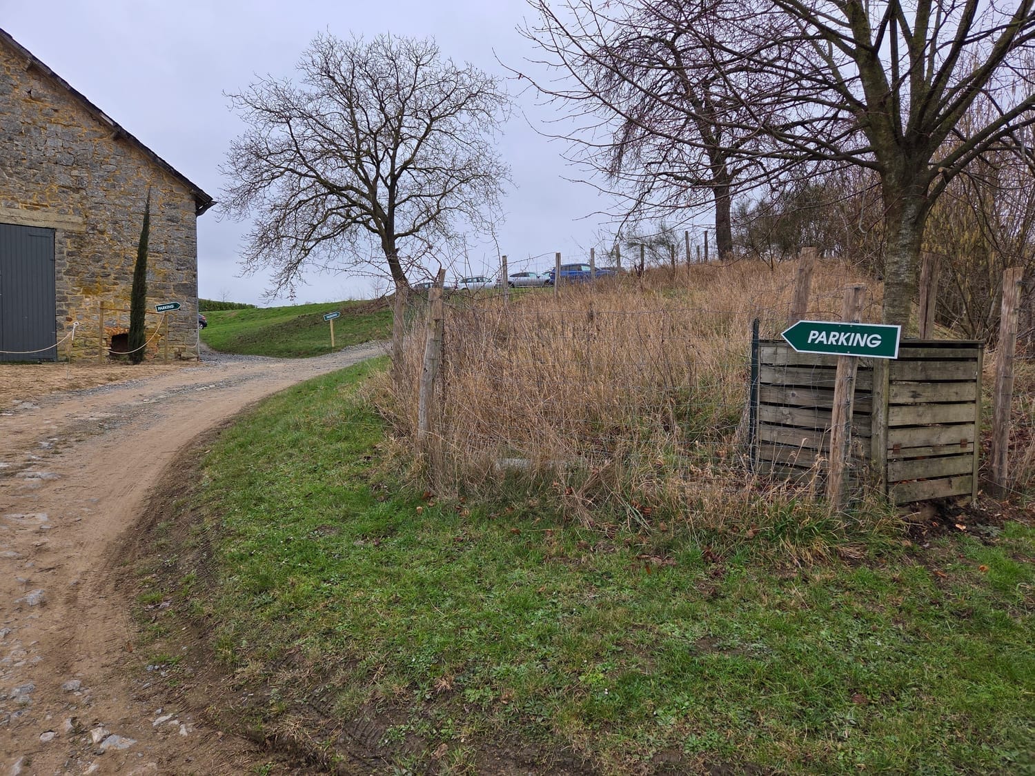 Lorsque vous descendez la rue d’Auwez et que vous arrivez à la ferme, vous verrez un chemin sur votre droite avec deux panneaux “parking”. Vous pouvez emprunter ce petit sentier. De nombreuses places de stationnement vous attendent un peu plus haut.